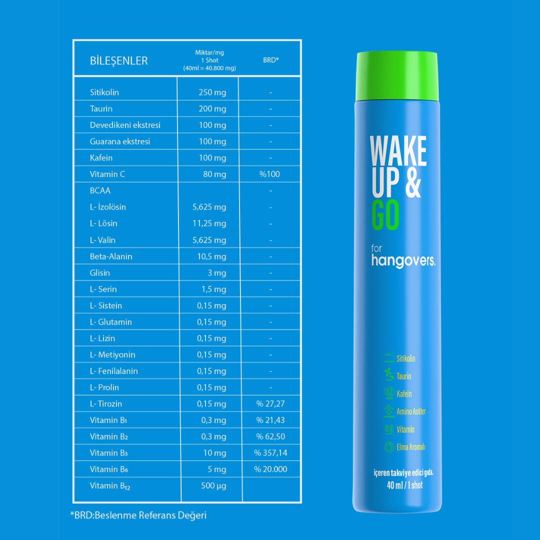 WakeUp&Go bir takviye edici gıdadır. İlaç değildir, hastalıkların tedavisinde kullanılmaz.